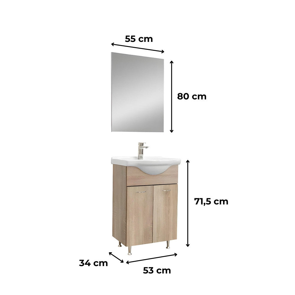 A bútor mindössze 53 cm széles, mégis elegendő tárolóhelyet kínál a fürdőszobai kellékek számára. Álló kivitelű alsószekrénye belül polcos elrendezésű, ajtóval zárható, így segít rendet tartani a mindennapokban.